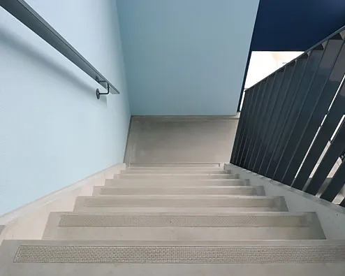 The roughness is achieved through the horizontally and vertically curved surface. The test result for GIAN 6 is just sufficient for leather shoe soles on wet surfaces. Therefore, we recommend cleaning the treads of GIAN 6 regularly, especially on the shaded side of the building. Due to the potential risk of slipperiness from algae formation, we advise against placing plants on walkways with the GIAN 6 structure. |